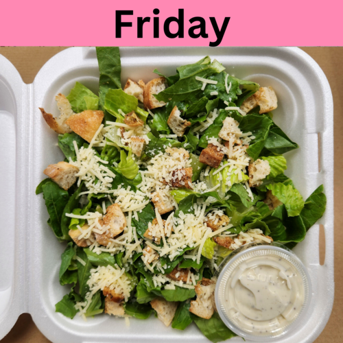 Caesar salad with crisp romaine lettuce, crunchy croutons,  Parmesan cheese. Served with creamy Caesar dressing on the side