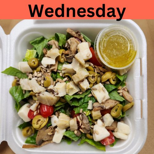 cherry tomatoes, mushrooms, artichoke, hearts of palm, green olives, and sunflower seeds, dressed in olive oil and lemon vinaigrette.